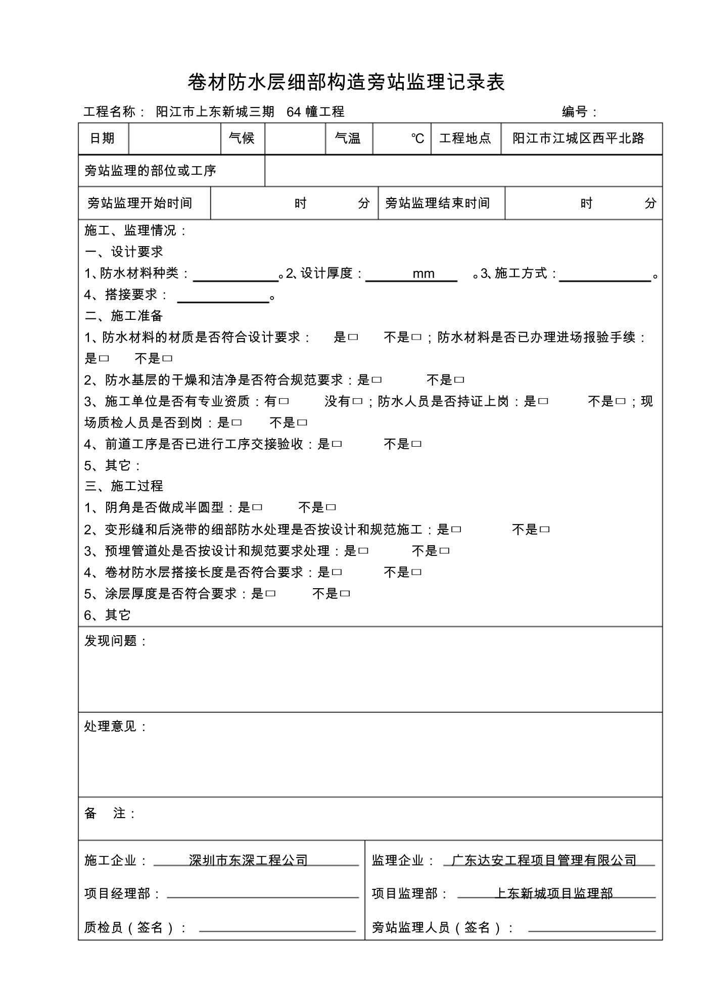 卷材防水层细部构造旁站监理记录表