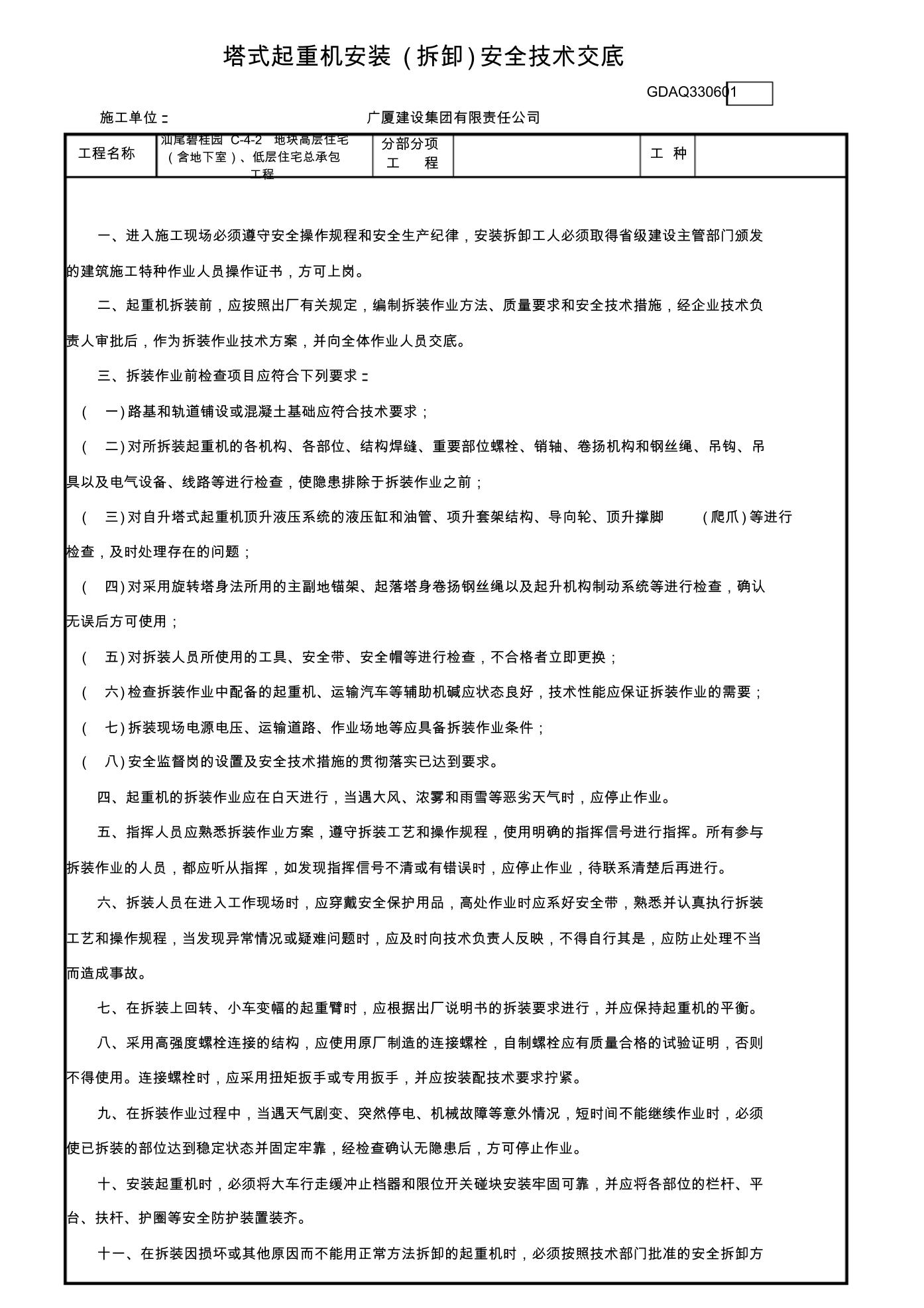 九、在拆装作业过程中,当遇天气剧变、突然停电、机械故障等意外情况,短时间不能继续作业时,必须