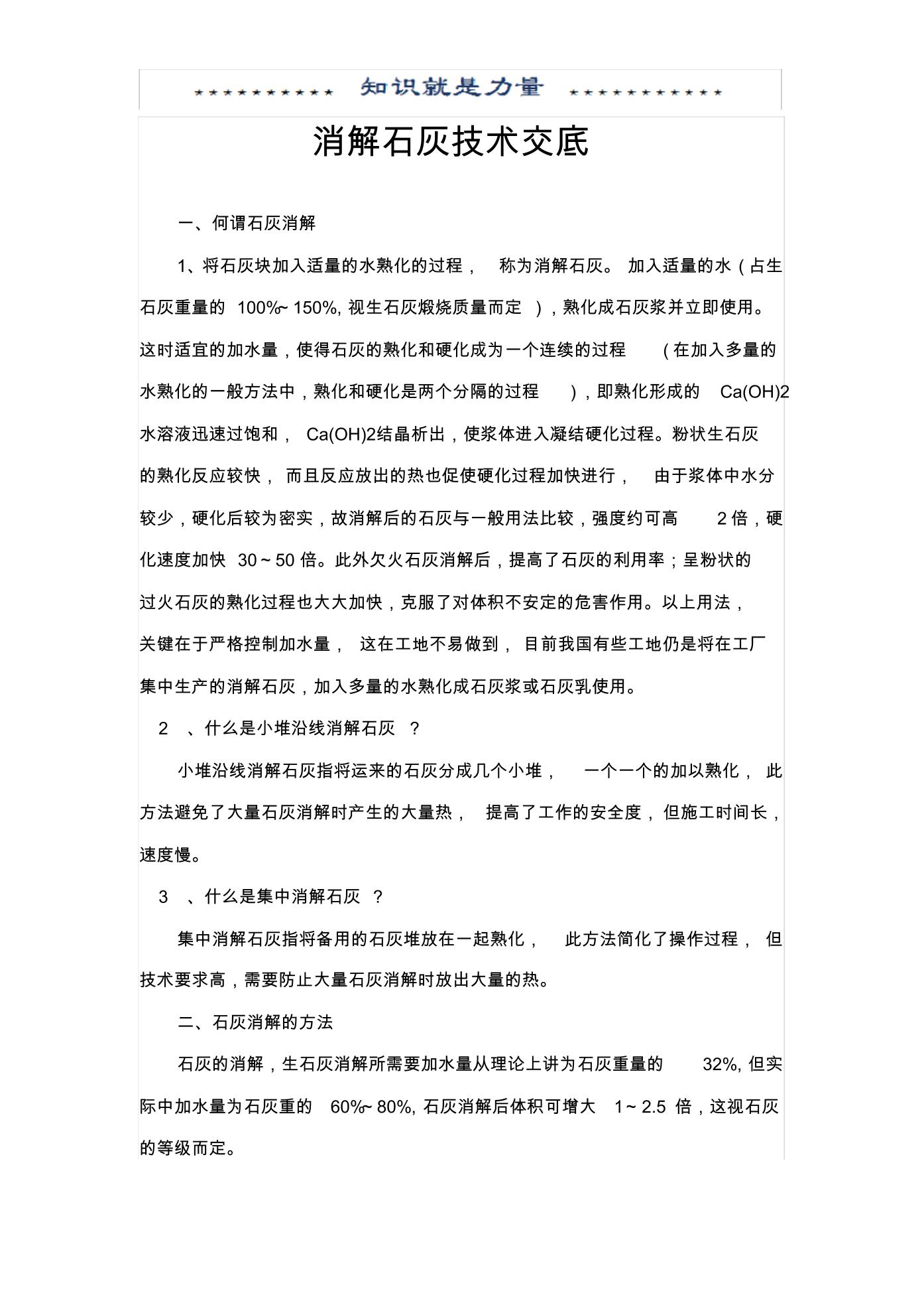 1、将石灰块加入适量的水熟化的过程, 称为消解石灰。 加入适量的水 (占生