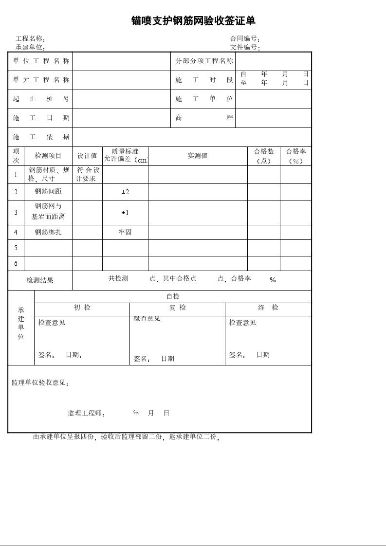 锚喷支护钢筋网验收签证单 工程名称: 合同编号: 承建单位: 文件编号: 单位工程名称 分部分项工程名称 单元工程名称 施工时段 自 年 月 日 至 年 月 日 起止桩号 施工单位 施工日期 高程 施工依据 项次 检测项目 设计值 质量标准 允许偏差(cm) 实测值 合格数 (点) 合格率 (%) 1 钢筋材质、规格、尺寸 符合设计要求 2 钢筋间距 ±2 3 钢筋网与 基岩面距离 ±1 4 钢筋绑扎 牢固