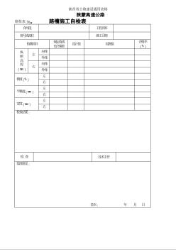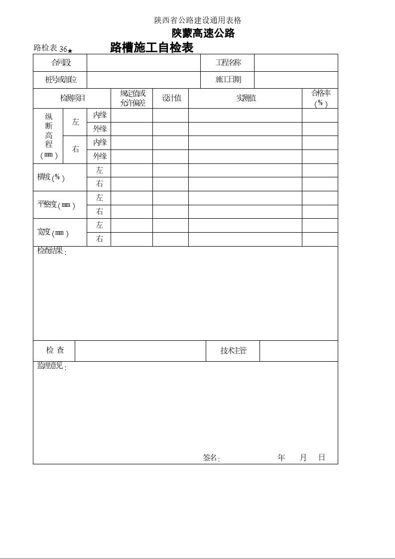 陕西省公路建设通用表格 陕蒙高速公路 路检表36★ 路槽施工自检表 合同段 工程名称 桩号或部位 施工日期 检测项目 规定值或 允许偏差 设计值 实测值 合格率(%) 纵 断 高 程 (mm) 左 内缘 外缘 右 内缘 外缘 横坡(%) 左 右 平整度(mm) 左 右 宽度(mm) 左 右 检查结果: 检 查 技术主管 监理意见: 签名: